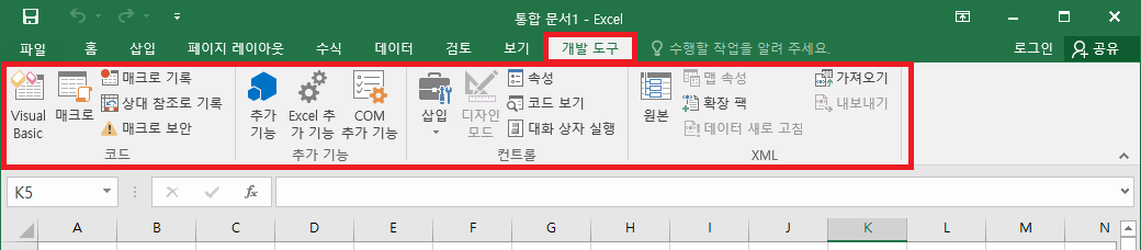VBA을 사용하기 앞서 개발도구 탭을 보이게 설정해야 합니다.