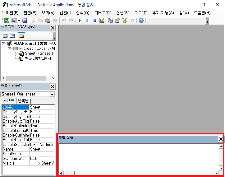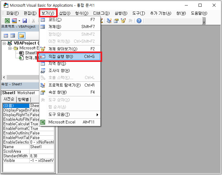 2. 나타난 VBE(Visual Basic Editor) 창에서 [보기 > 직접 실행 창] 을 클릭합니다.