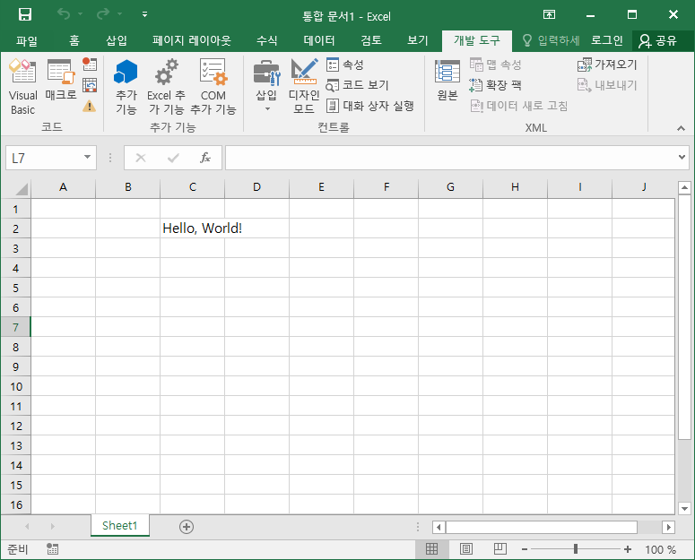 2. 아래와 같이 C2 셀에 "Hello, World!" 값이 입력된 것을 확인할 수 있습니다.