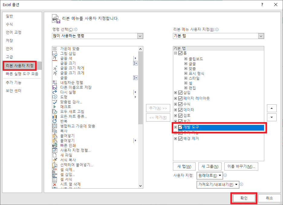 3. [리본 사용자 지정] > [개발 도구 체크] > [확인] 버튼을 순차적으로 클릭합니다.