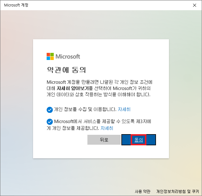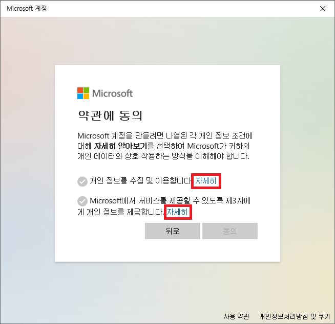 ▶ 약관에 동의를 위하여 "자세히"를 클릭하여 약관을 읽어보신 후 "뒤로" 버튼을 클릭하여 2개의 약관에 모두 체크를 하신 뒤 "동의" 버튼을 클릭합니다.