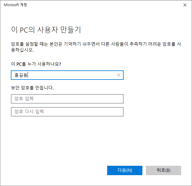 ▶ 드디어 마지막입니다. 사용자의 이름(아이디)을 입력한 후 "다음" 버튼을 눌러주시면 완성입니다.