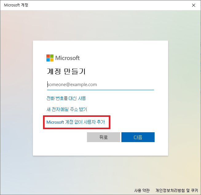 ▶ 로컬 계정으로 생성하는 방법 이기 때문에 "Microsoft 계정 없이 사용자 추가"를 클릭합니다.