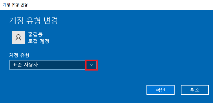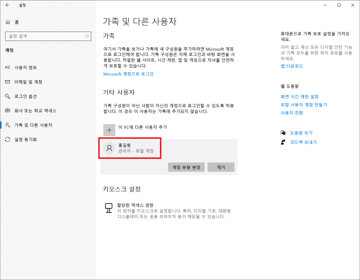저는 홍길동 계정을 표준 사용자에서 관리자로 변경하였습니다.