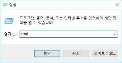 ▶ 실행창에 cmd를 입력하고 확인 버튼을 눌러줍니다.